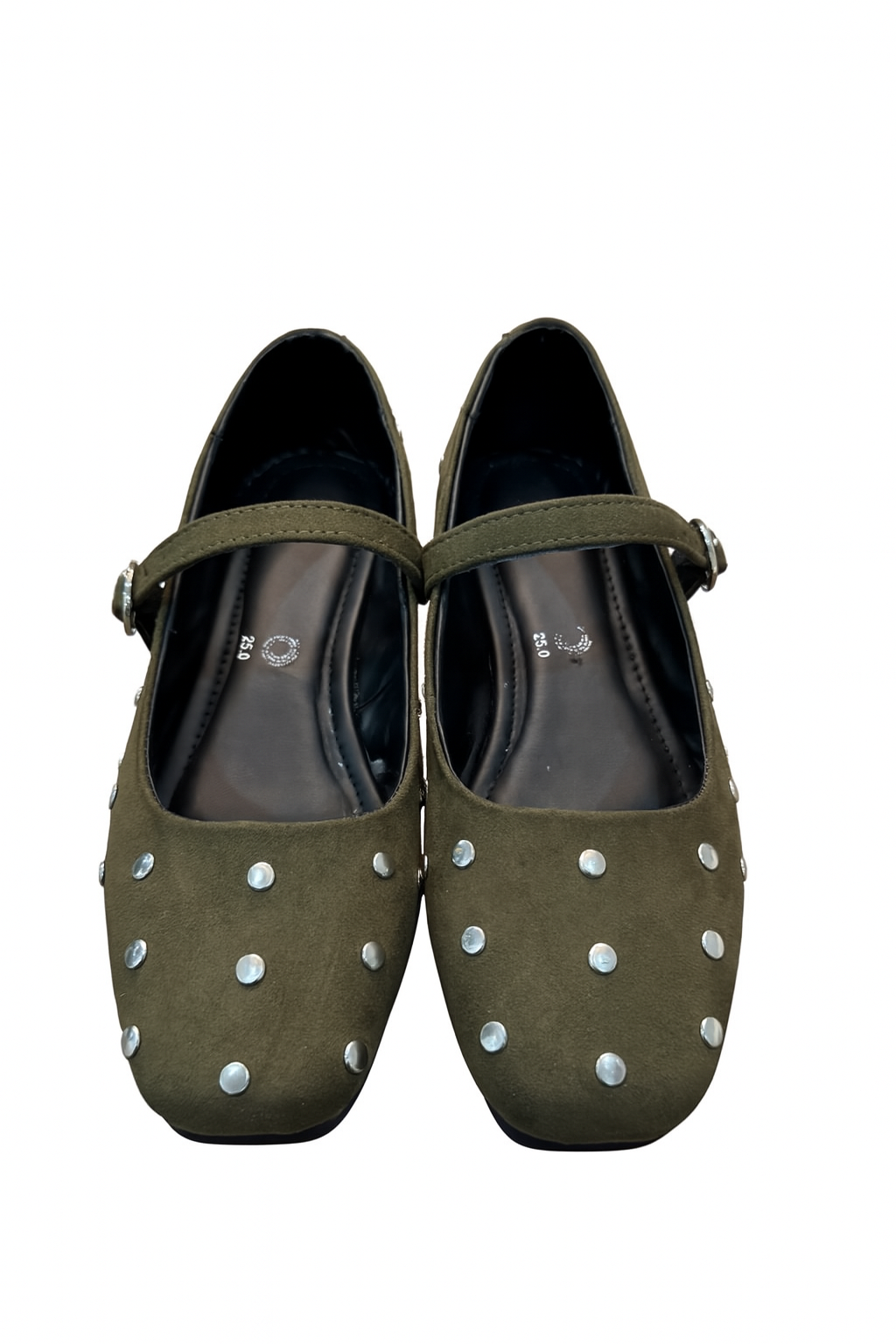 Diseño femenino y cómodo que combina estilo y versatilidad. Nuestras Balerinas Olivia en tono verde olivo con detalles de mini estroperoles son perfectas para darle un toque elegante a cualquier outfit.
